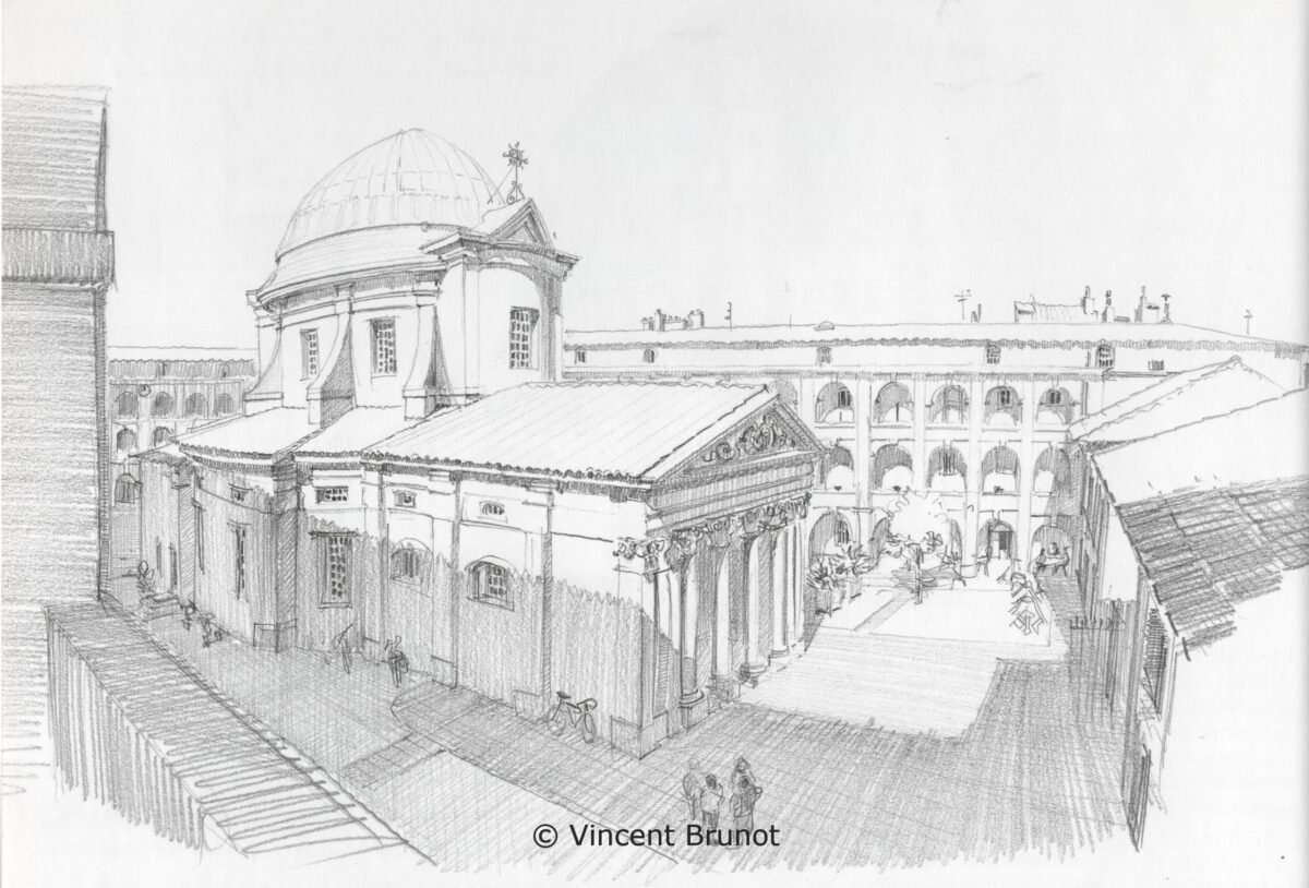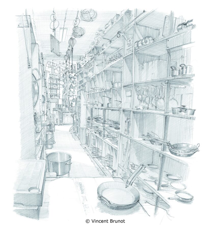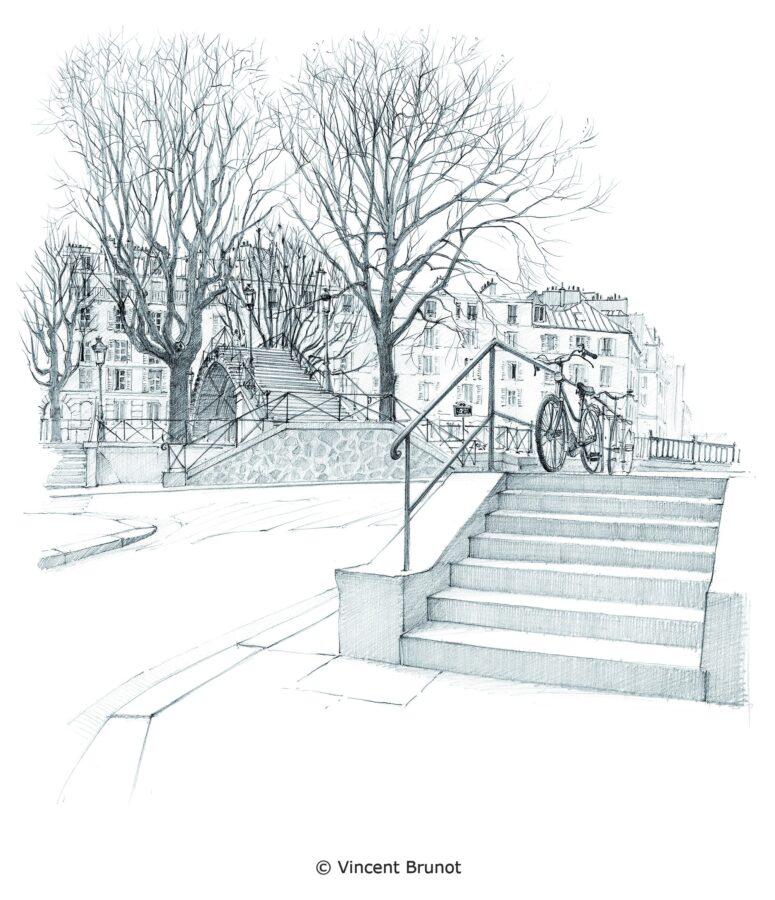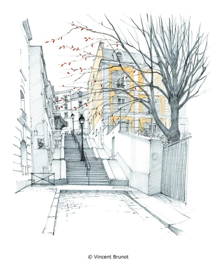 Mon engouement pour la perspective, pour la précision du trait et mon goût pour le détail ont bien sûr influencé mon travail d'illustrateur. J'aime dessiner sur le motif et retranscrire sur le papier la profondeur des espaces que j'observe et, grâce aux jeux d'ombre et de lumière et au choix des angles de vue, je cherche à faire entrer le spectateur dans la feuille de papier.